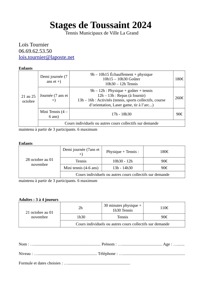 Le Tennis Club de Ville-La-Grand (TCVLG) est heureux de proposer à ses membres et à tous les passionnés de tennis ses stages de la Toussaint. Encadrés par nos entraîneurs expérimentés Loïs Tournier et Frédéric Moy, ces stages offrent des formules adaptées à tous les niveaux et à tous les âges, afin de progresser tout en s’amusant pendant les vacances scolaires.